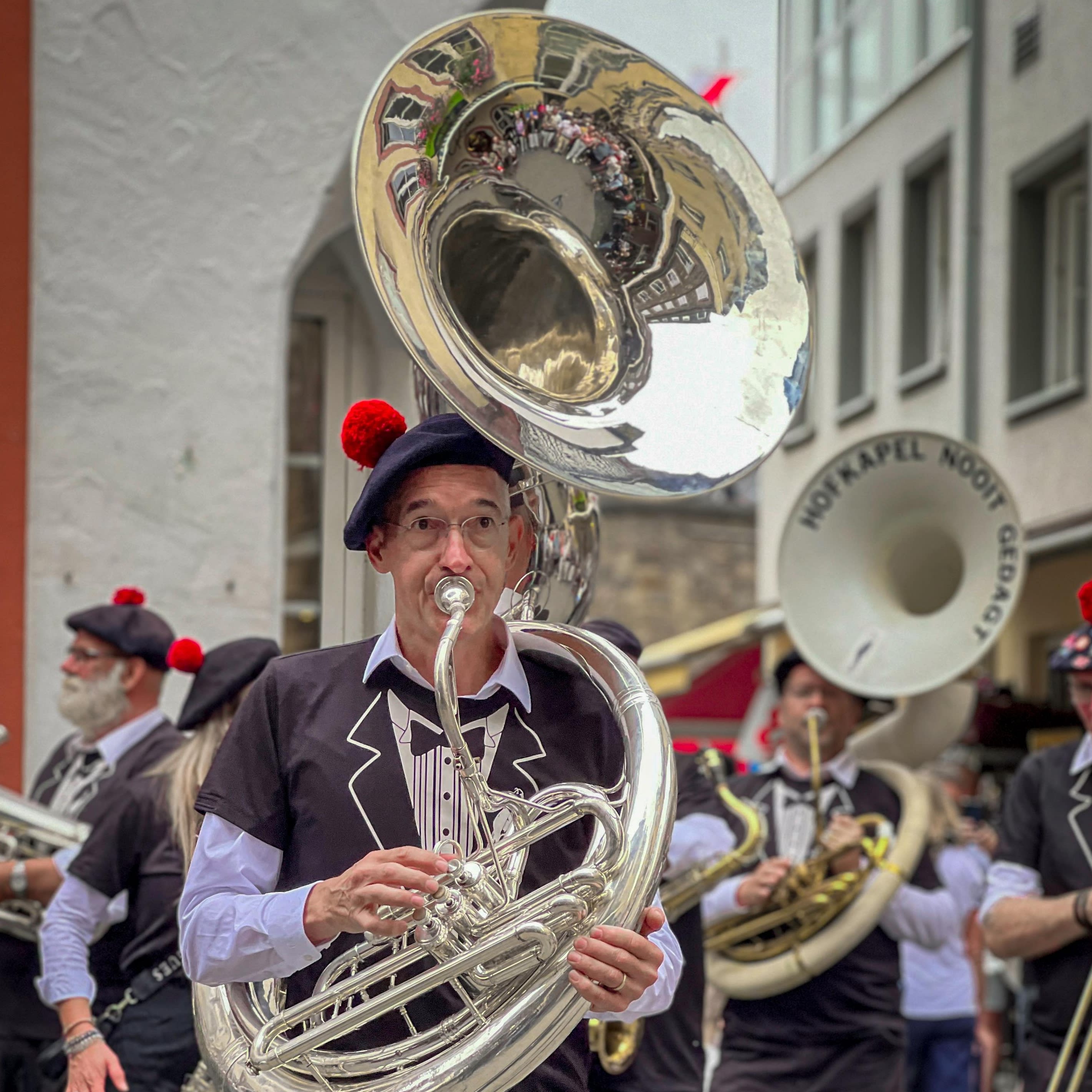 A large, powerful brass instrument with deep tones, perfect for marching bands and orchestras.
